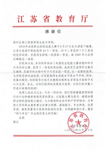 2010年6月30日,江蘇省教育廳向我院發來感謝信,向我院在全國技能大賽取得的優異成績表示感謝。